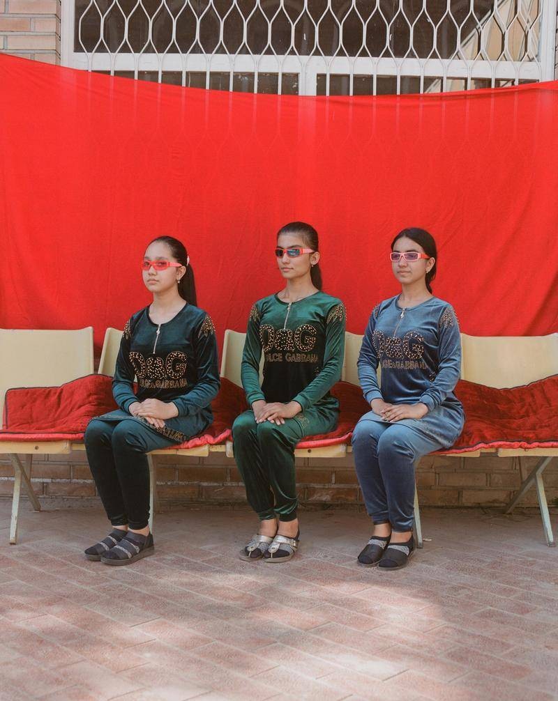 画面中,色彩厚重、质感拙朴的乌兹别克斯坦传统服饰,附上夸张闪耀、象征财富的西方奢侈品LOGO,在库尔班巴耶夫精致的布景和构图中,两种不同文化之间呈现的割裂感被消解,在画面中恰到好处地相互融合。一种破坏秩序的美感涌动的同时,隐约带有对乌兹别克斯坦消费主义文化揶揄的意味,在暗红色幕布的映衬下,看起来像是某场荒诞派戏剧剧照。
