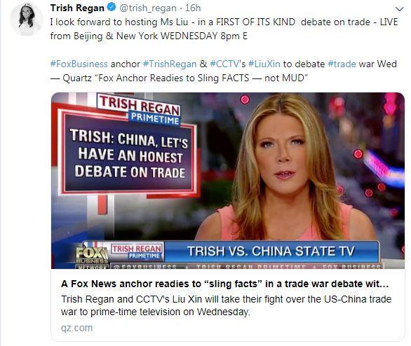 CGTN女主播刘欣于5月30日早8:25(美东时间29日晚8:25)应约与FOX商业频道女主播翠西•里根(Trish Regan)就中美贸易等相关话题进行了一场公开辩论。