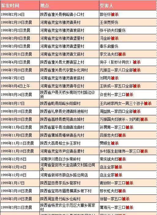 11月6日凌晨3时左右,陕西省富平县流曲镇流曲村29岁的店主孙渭南一家三口被杀。11月8日到当年12月18日吕振忠老两口、村民贾顺生、赵绪伟一家三口、常庆斌夫妇、登封市大金店镇文村和新郑市薛店乡两个路边商店惨遭血案均是全家被杀。