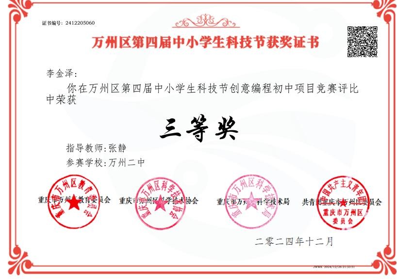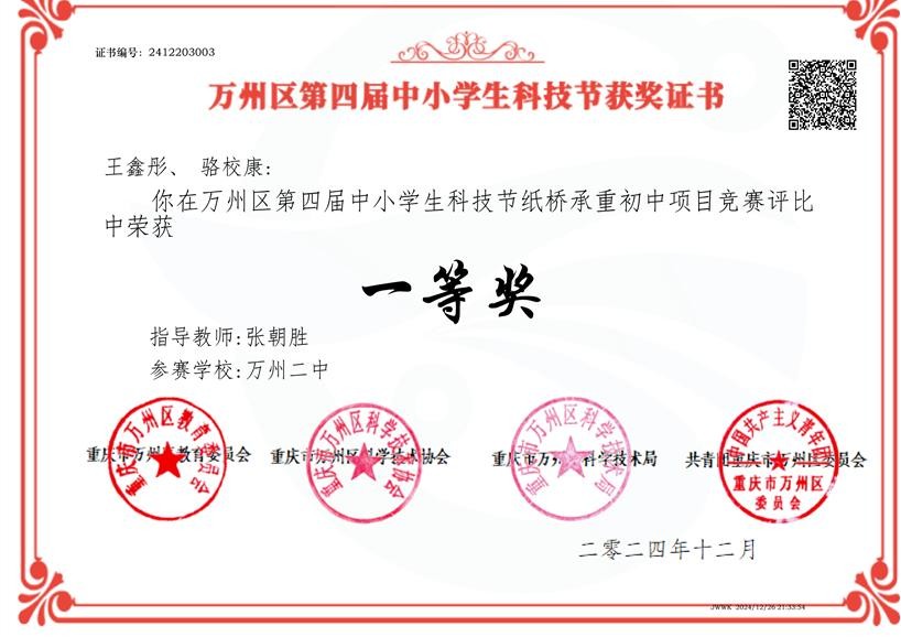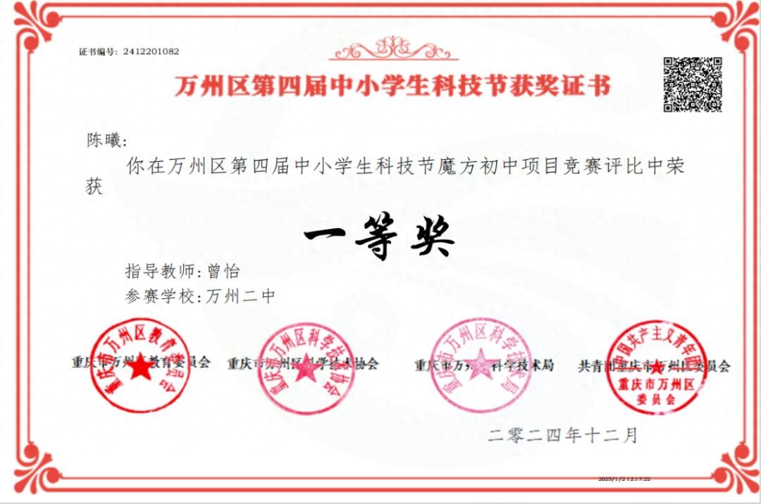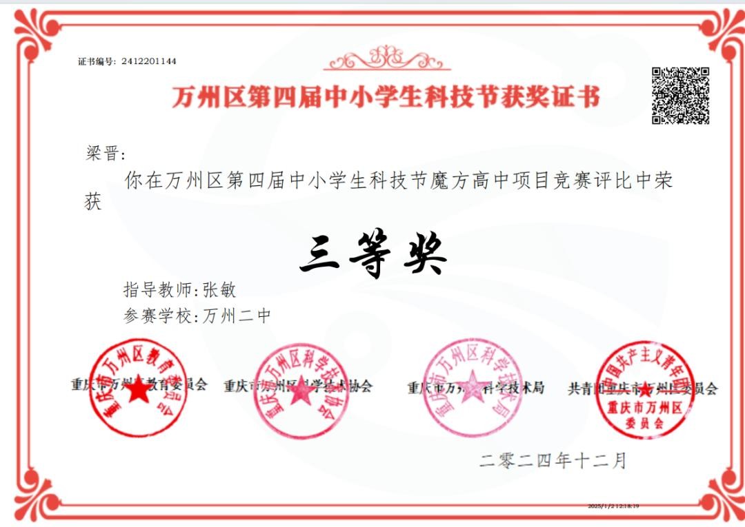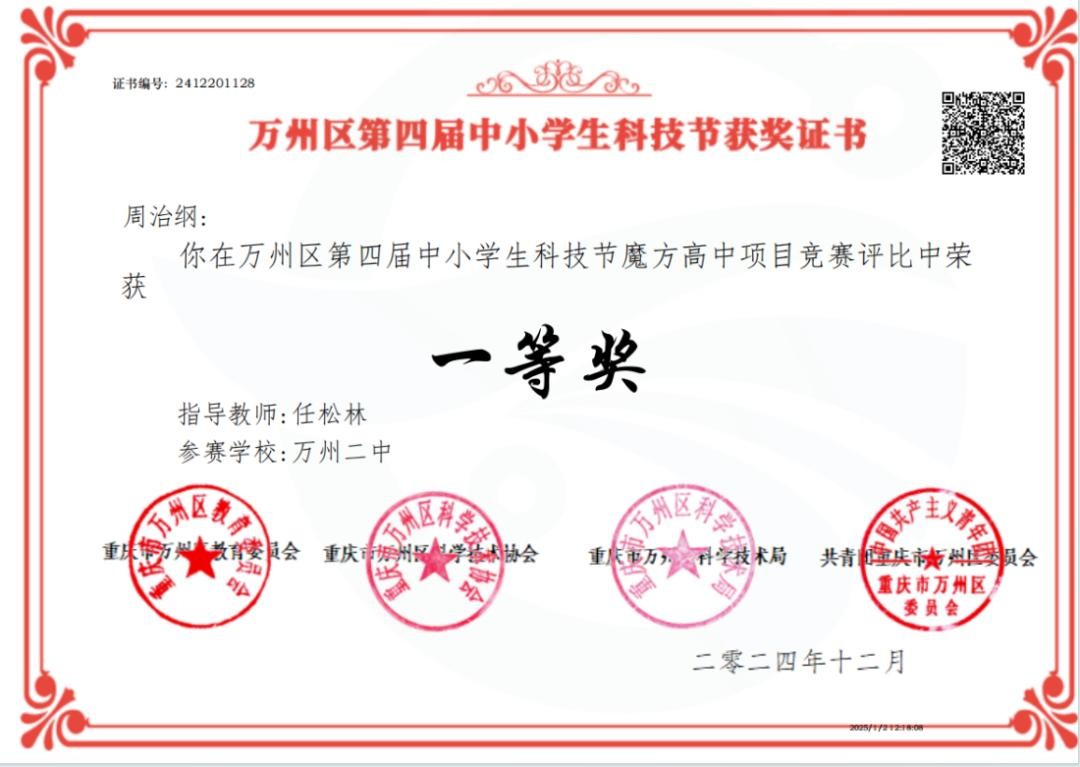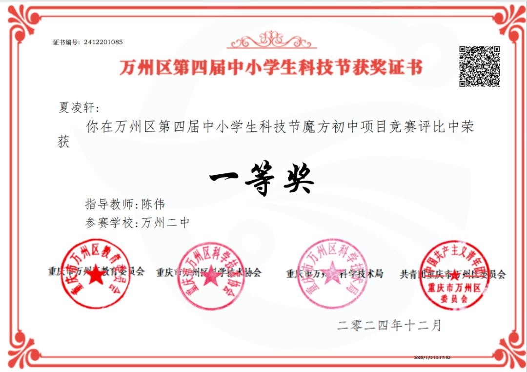 具体获奖情况如下:万州二中共有15名学生荣获一等奖,9名学生荣获二等奖,12名学生荣获三等奖。不仅如此,万州二中凭借出色的组织工作,荣获“优秀组织单位”荣誉称号;另有12名教师凭借在活动中对学生的悉心指导,获评“优秀指导教师”。