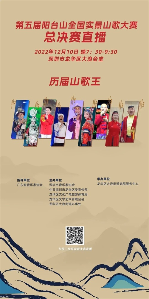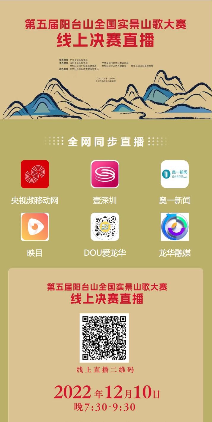 为传承山歌文化,弘扬时代精神,为全国山歌爱好者搭建一个山歌文化交流、沟通、切磋、学习的平台,在广东省音乐家协会指导下,深圳市音乐家协会、龙华区委宣传部、龙华区文化广电旅游体育局、龙华区文学艺术界联合会、龙华区大浪街道办事处联合主办了“阳台山全国实景山歌大赛”。