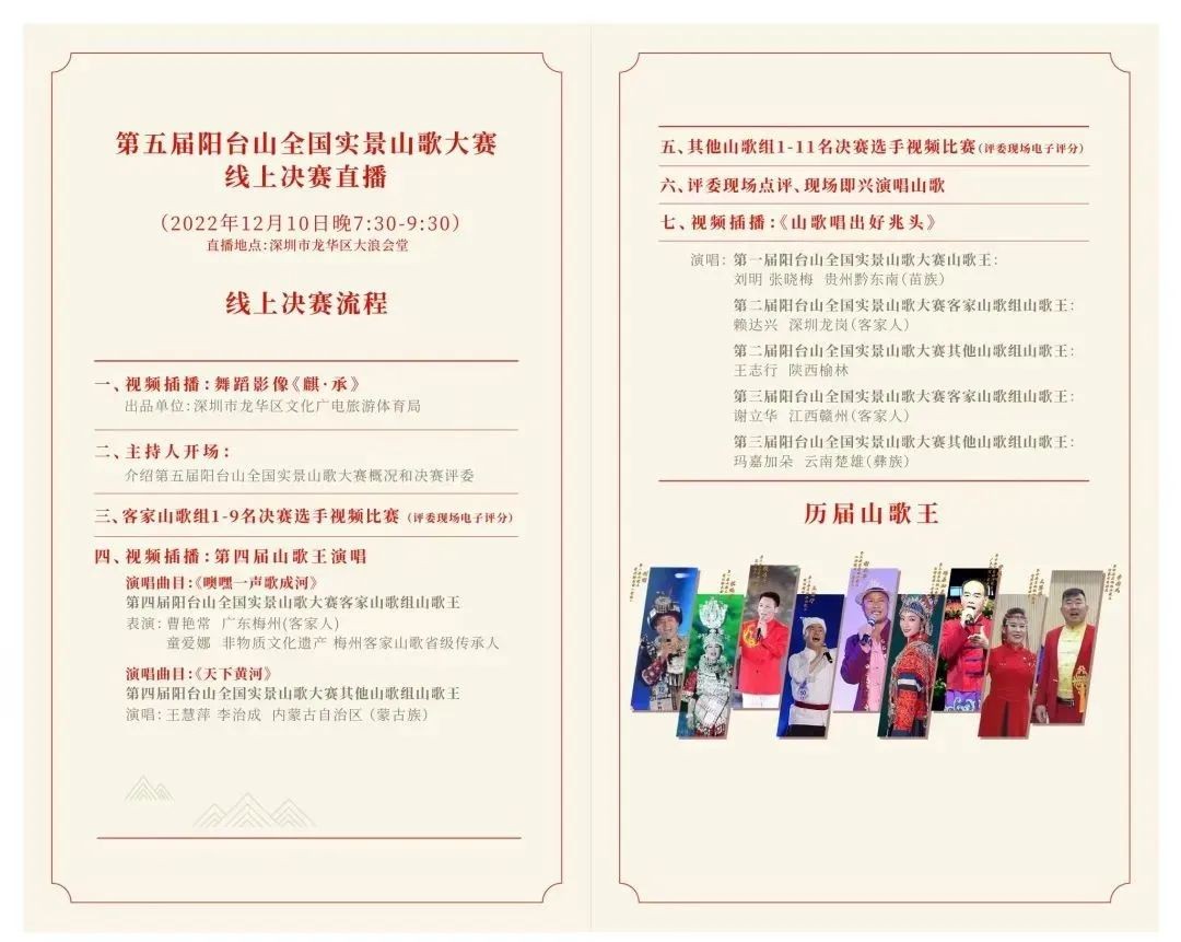 本次大赛客家山歌组1-9名决赛选手将进行视频比赛,评委现场电子评分。舞蹈影像《麒· 承》和《山歌唱出好兆头》等节目将以视频插播的形式呈现。