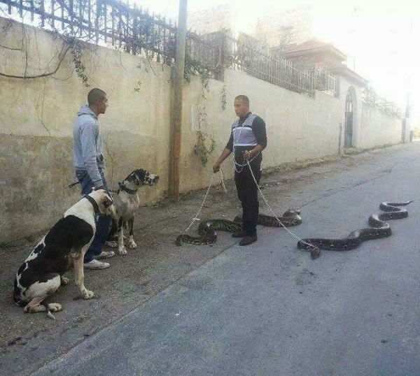 一男子的手被蟒蛇死死缠绕着