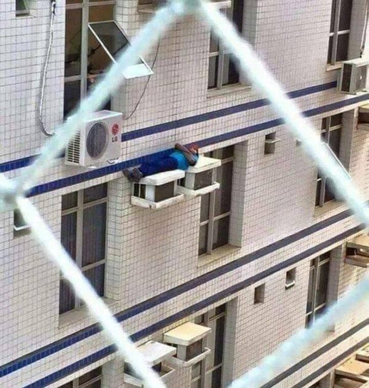 窗外一男子在空调架上睡觉