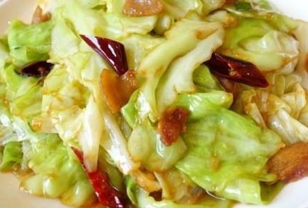 三、锅中放油,葱、姜、蒜干辣椒爆香,放入包菜,加食用盐、老陈醋、鸡精、煸炒入味出锅,装盘即可。