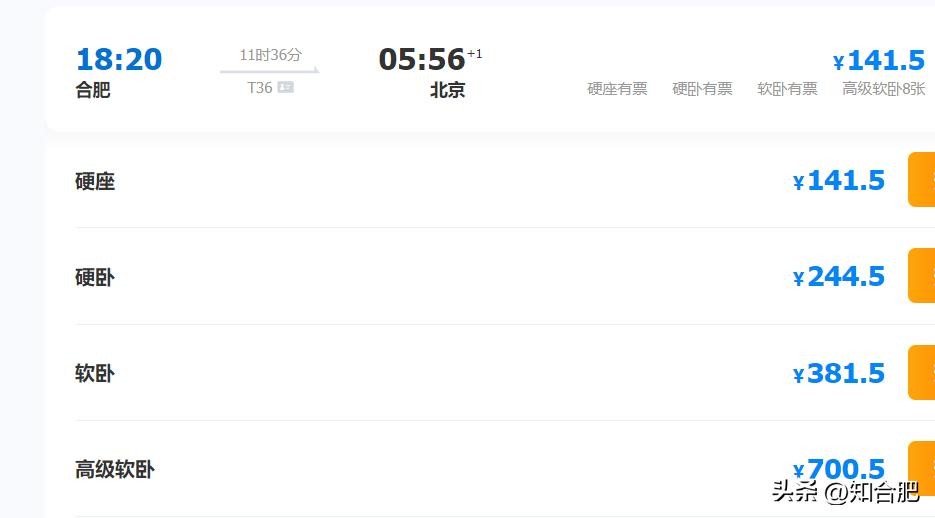 乘坐T36次旅客列车,从合肥到北京,如果是硬座,只需要141.5元。
