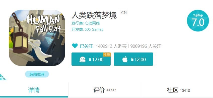最近在TapTap游戏平台新上线了一款移植于Steam平台的手游《人类一败涂地》,又名《人类跌入梦境》,这游戏在端游平台steam的时候,售价为19元,而在手游售价目前只需要12元,不论是在安卓机还是苹果系统上,12元的定价相对于一款休闲风格的游戏来说还是相对比较昂贵的,但是如果算在steam平台上,这款端游就可以说相对比较便宜了。