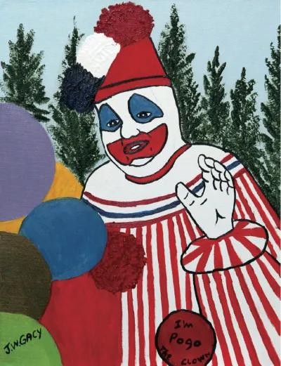 盖西的画中常常出现小丑形象,他也经常以这个扮相出现在慈善机构,为孩子们办活动,全身心地扮演着小丑角色——坡格。