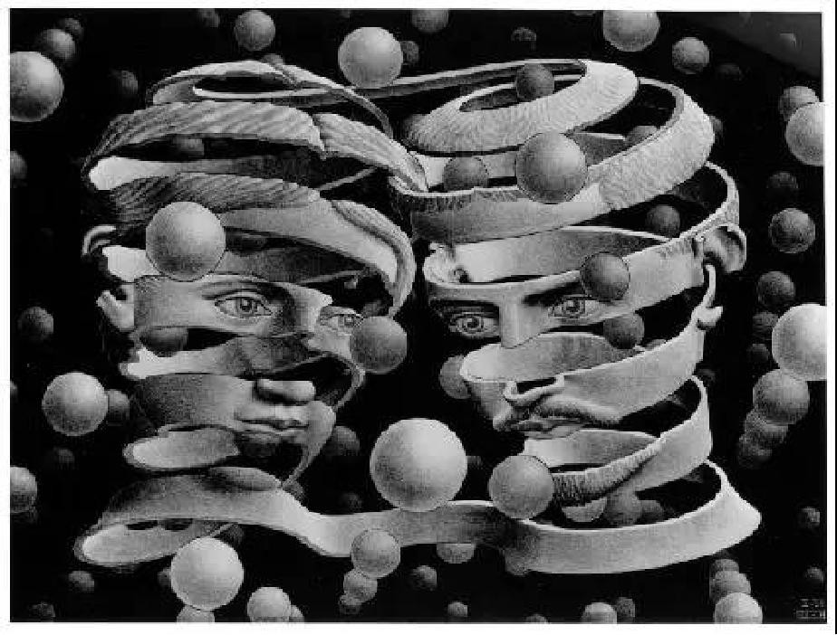 这个作品叫《骑士》,埃舍尔试图在二维空间里表现莫比乌斯带,但他巧妙地避开了穿越,用平面镶嵌将莫比乌斯环中间连在一起,带子正反两面行走着同向却反色的骑士,本来在莫比乌斯带走的骑士走遍带子的两面都不可能改变颜色,但通过这个链接的平面,互为反色的骑士确镶嵌易位了。物理学家杨振宁的《基本粒子发现简史》封面就是用的这幅作品