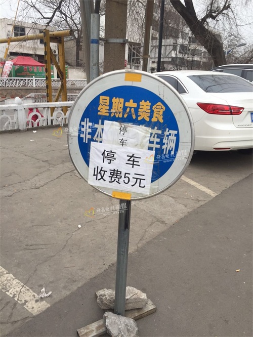 许昌市区华佗路和解放路交叉口,一位老大爷正在向刚刚停好车的司机索要停车费,附近树有“停车收费5元”的牌子。